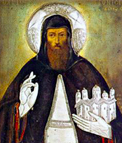 Преподобный Дионисий (XVI в.) родился в селении Платина в бедной семье. Его младенчество было отмечено знамением: над колыбелью новорожденного сиял Крест. С юных лет возлюбив чтение Божественных книг и молитву, святой Дионисий по смерти родителей решил принять монашество. Он отправился на Святую Афонскую Гору, где поселился у благочестивого старца пресвитера Серафима и под его руководством стал вести подвижническую жизнь, в особенности соблюдая строгий пост. Так, в Страстную неделю он уходил в лес и питался одними каштанами.
