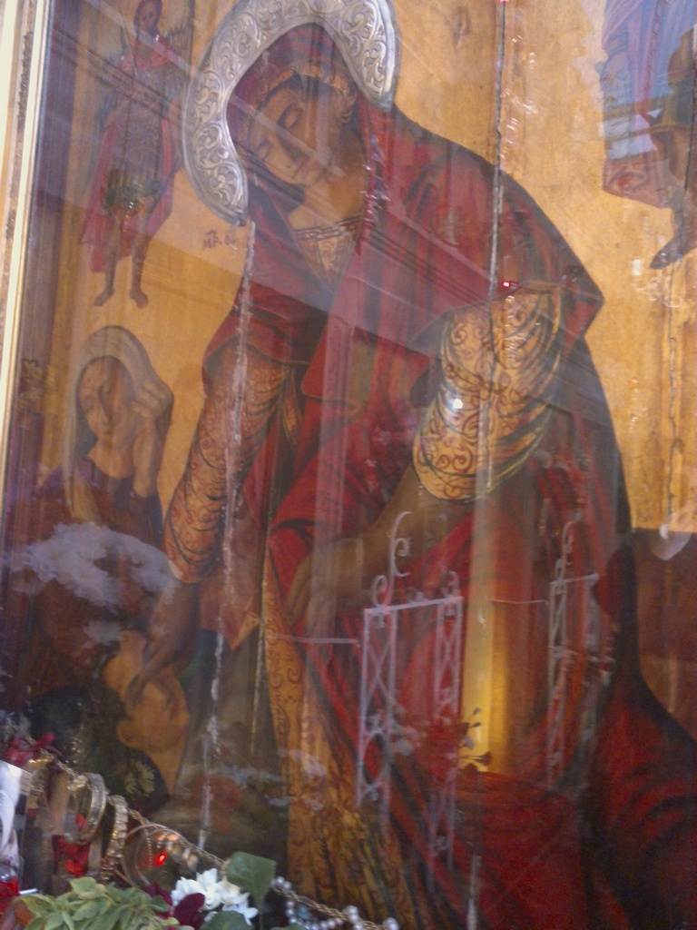 Десница священномученика Парфения – тоже святыня с удивительной историей. Отец Поликарп рассказал, что придя на Афон, а он прожил там восемь лет и был послушником преподобного Паисия Святогорца, он заметил в храме одну темную от копоти икону. Приглядевшись, увидел, что там изображен святой, который держит руку на женской груди. Это был Парфений Лампсакийский. Отец Поликарп очень удивился такой иконографии и стал изучать житие этого святого. Он жил в III веке в городе Лампсаки (ныне на территории Турции) и славился тем, что исцелял от рака. Поскольку рак груди у женщин очень распространен, то множество исцелений от этой болезни стало поводом даже запечатлеть это чудо на иконе святого Парфения. Именно та правая рука, которой святой касался и исцелял болящих, находится ныне в монастыре Богородицы Касопитры.