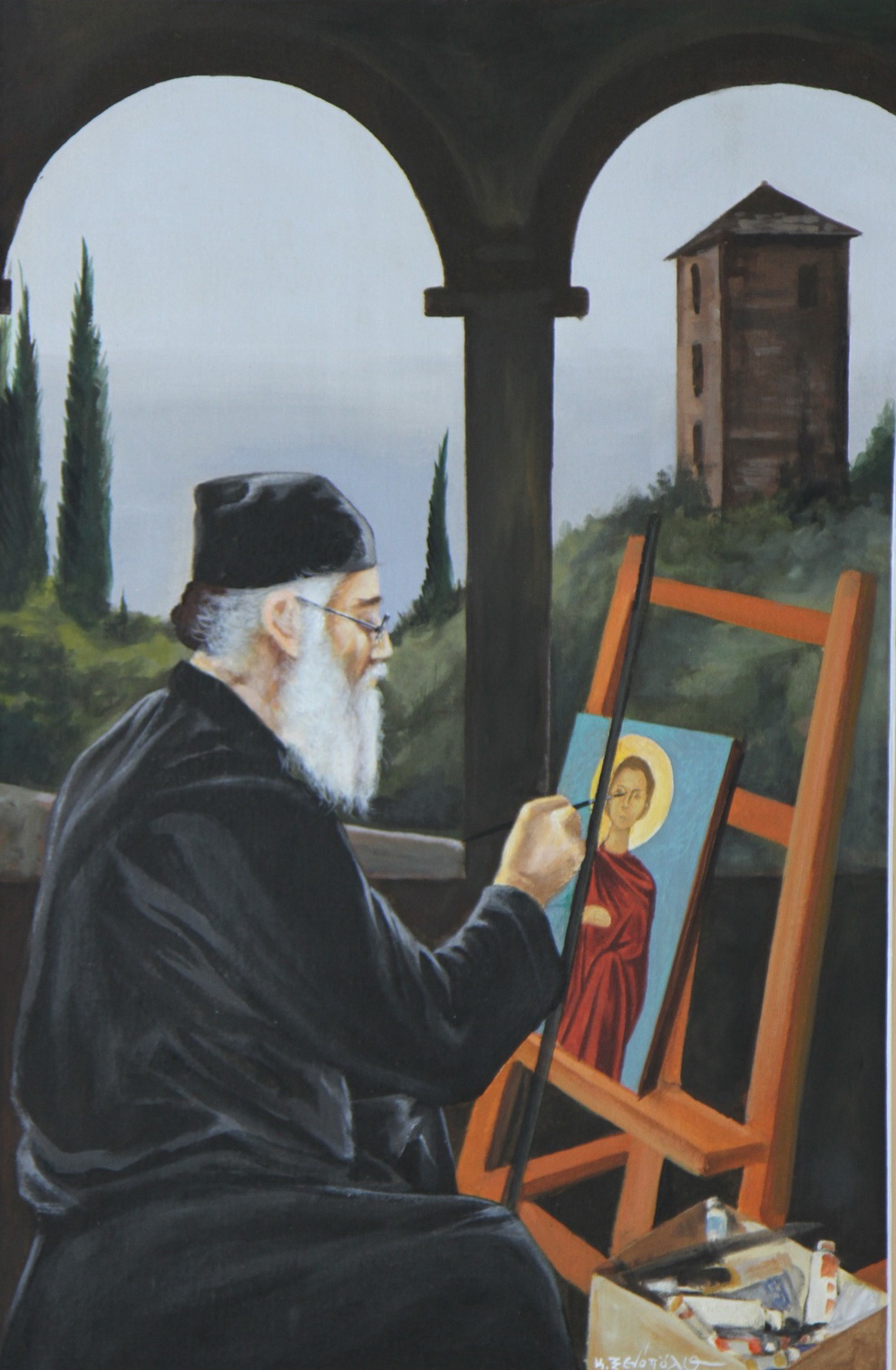 Он – художник, который удивительно тонко передает в живописи богословский аспект. Он показывают сцены из иноческой жизни, и лица, которые отражают монашеский опыт. Эти картины говорят духовно внутри вас, они выражают теологию монашества. Мне кажется, порой, что я слышу византийскую музыку, глядя на молитвенную сосредоточенность художника, направляющегося на Афон с мольбертом.