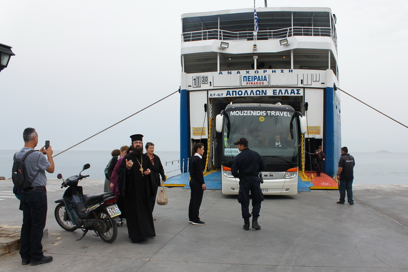 В первый день мы прилетели в Салоники из Киева и сразу же из аэропорта на автобусе поехали в Афины. Ехать немало, чуть больше 500 км. Поэтому в столице Греции мы оказались поздно вечером, а утром предстоял выезд в порт и паромная переправа на остров Эгину в гости к Святителю Нектарию.