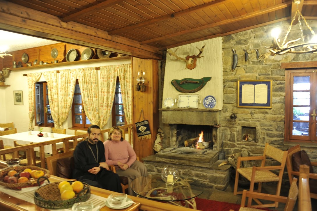 Знаете, у каждого из нас, наверное, есть готовая картинка при названии «Греция». Это конечно и святыни, и монастыри, и церквушки, затерянные среди скал, и пляжи с золотистым песком, и ласковое море. А сейчас представьте себе, что Вы прилетели в Грецию, сели в автобус, за окном темно, вышли из него и попали в Швейцарию. Это не фигура речи. В сопровождении охотничьих собак (которые были столь дружелюбны и игривы) мы попали в настоящий дом егерей. Здесь присутствовали все атрибуты: камин, мебель из массивного дуба, картины, люстры, изготовленные из рогов оленей и горных козлов. В отеле тепло, уютно. Хозяин настолько лучезарный и приветливый, что, кажется, Вы приехали не как турист, а как его личный гость.