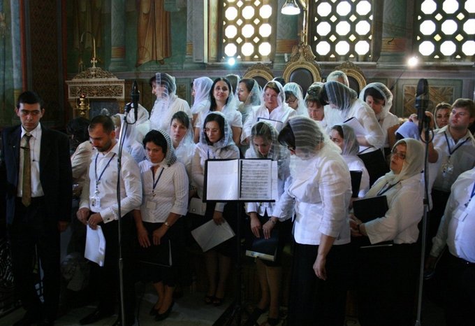 В храме собралось множество молящихся, как прихожан храма, так и паломников. Пел хор храма великомученика Пантелеимона, который является приходом русской общины. Поэтому звучало традиционное российское пение.