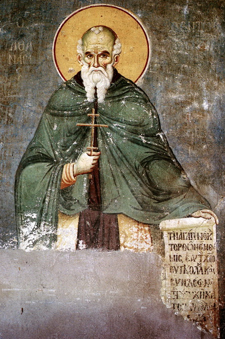 Преподобный Афанасий Афонский. Фреска церкви Успения Богородицы в Протате. Афон. Начало XIV в.
