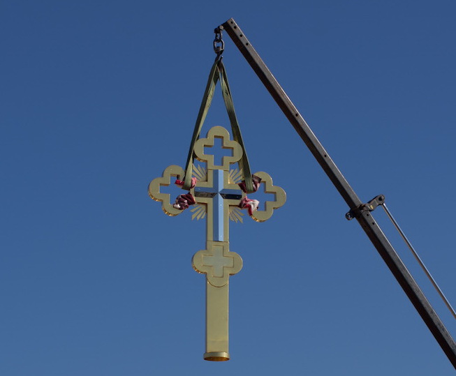 Крест – подарок храму Панагия Сумела от российских благотворителей. Он позолочен, как это принято в России, и потому не похож на кресты, венчающие греческие храмы.