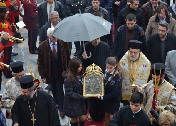 Вчера вечернее богослужение возглавил Его Высокопреосвященство митрополит Кикладских островов Дорофей. Несмотря на неблагоприятную погоду состоялся крестный ход из храма Благовещения на набережную с участием митрополита, священников, президента и членов правления благотворительного фонда Мегалохари, мэра и представителей городского совета, военных и политиков Кикладских островов, руководителей сил безопасности, директоров школ, школьников и студентов всех уровней, а также огромного числа паломников с Тиноса, Сироса, Миконоса, Хиоса, из Афин, Трикалы, Метеор, Салоник и других районов Греции.
