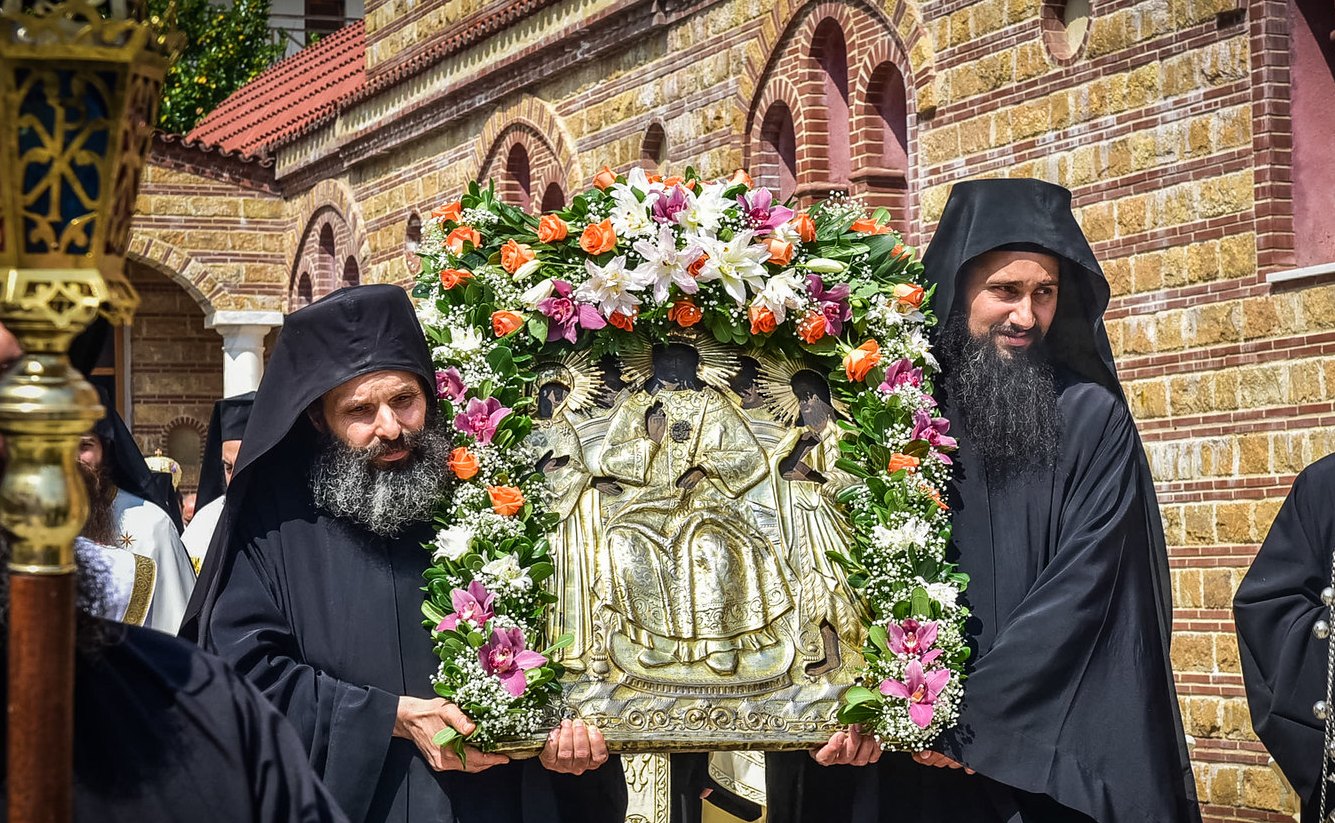 После Литургии прошел крестный ход по улицам Мелиссохори, и братия обители пригласили всех паломников на трапезу.